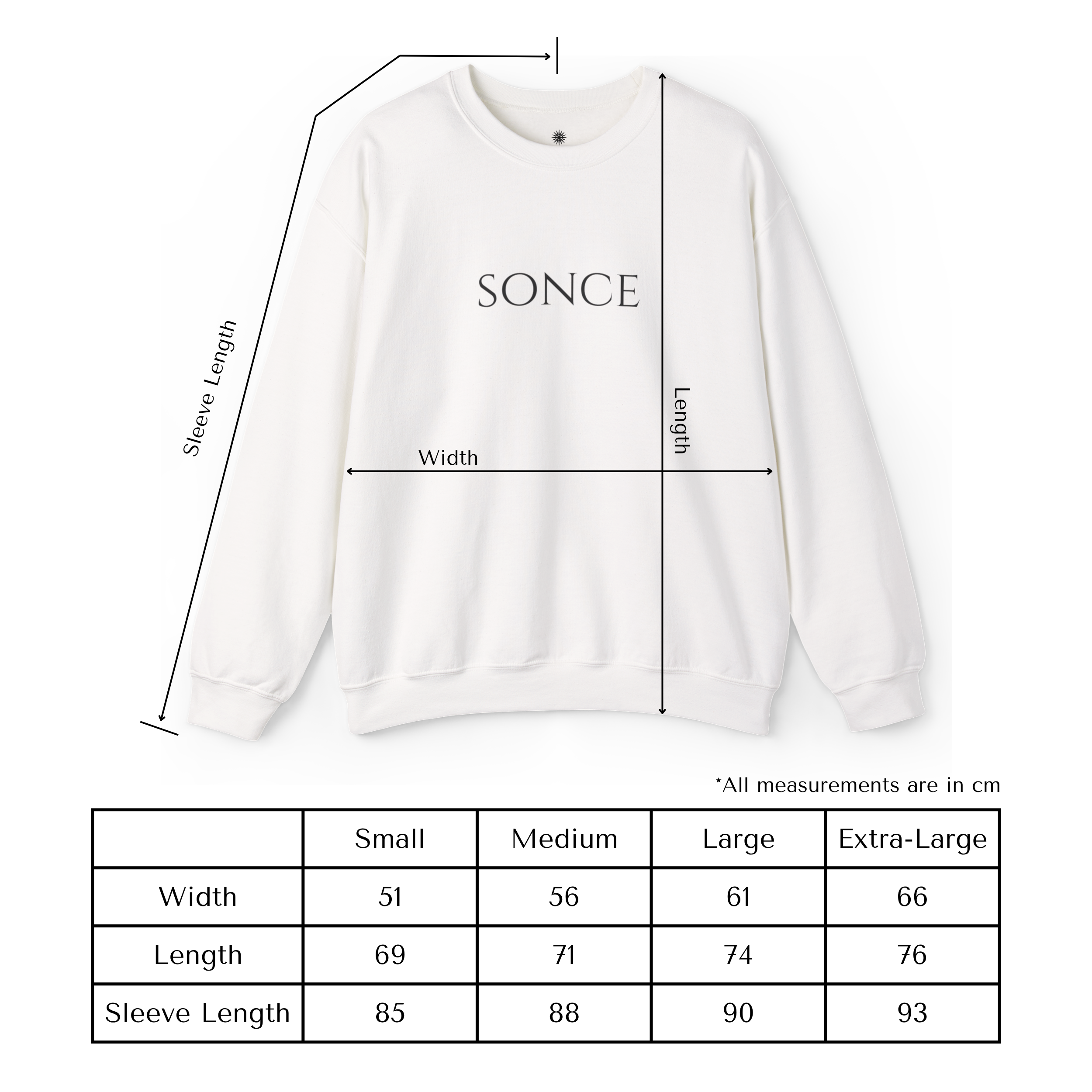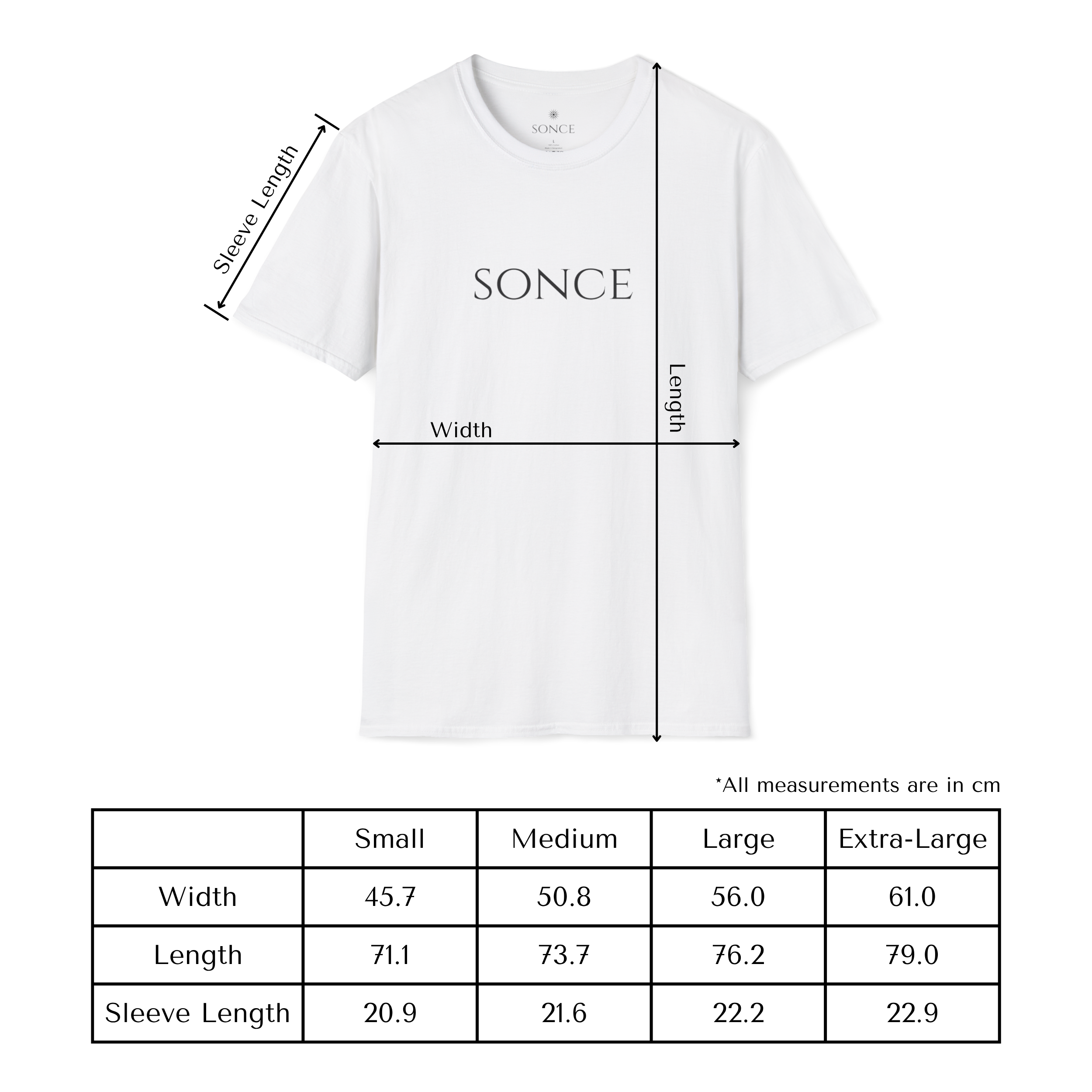 Width: Garment laid flat and measured across the chest starting 1 inch/2.54cm below each armhole.